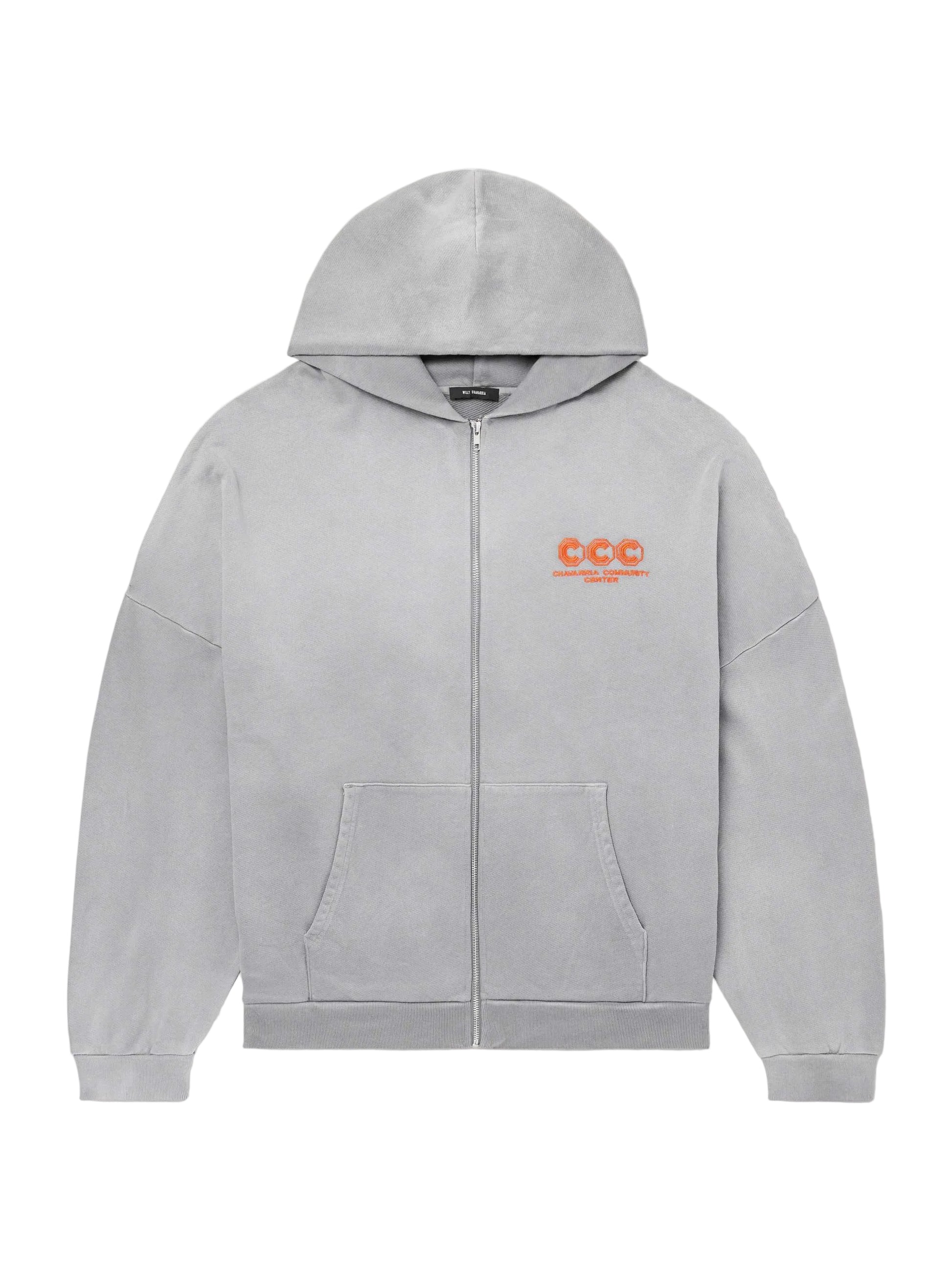Willy Chavarria "CCC" Hooligan Zip Through Hoodie in concreate colour Contrasting red embroidery – with the inscription “CCC CHAVARRIA COMMUNITY CENTER” on the front and back.