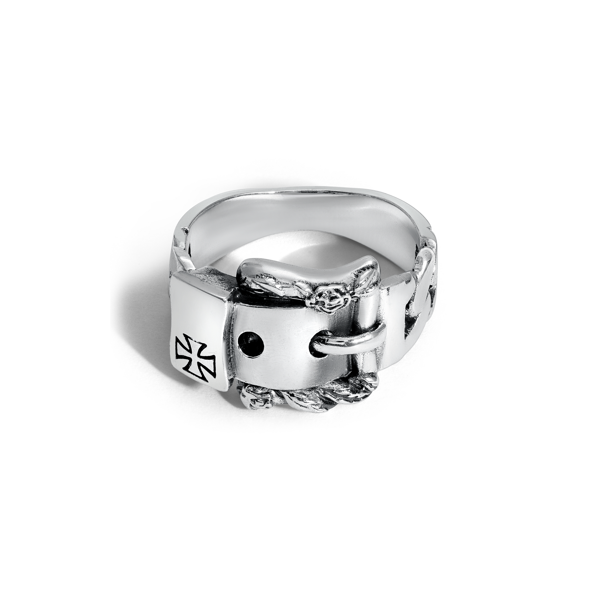 Ring in motif of signature rose belt buckle and iron cross loop.